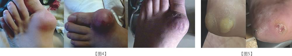 接受抗風(fēng)竤治療的部分痛風(fēng)患者在出現(xiàn)紅、腫、熱、痛、發(fā)燒等無菌性炎癥反應(yīng)之后,痛風(fēng)石隨之會出現(xiàn)明顯變軟、縮小的情,部分患者出現(xiàn)痛風(fēng)石表皮積液甚至尿酸鹽從腳部和手部直接排出的現(xiàn)象【見圖4、圖5】。還有一種情況,某些患者關(guān)節(jié)四肢表面原本沒有痛風(fēng)石,接受抗風(fēng)竤治療 后卻在腳背或者手背鼓起軟包。這是由于關(guān)節(jié)腔內(nèi)的尿酸鹽結(jié)晶快速溶解但未能及時排出引起的,堅持治療幾天后就會代謝排出體外,不必擔(dān)心。