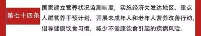 第七十四條:國家建立營養(yǎng)狀況監(jiān)測制度,實施經(jīng)濟欠發(fā)達地區(qū)、重點人群營養(yǎng)干預計劃,開展未成年人和老年人營養(yǎng)改善行動,倡導健康飲食習慣,減少不健康飲食引起的疾病風險。